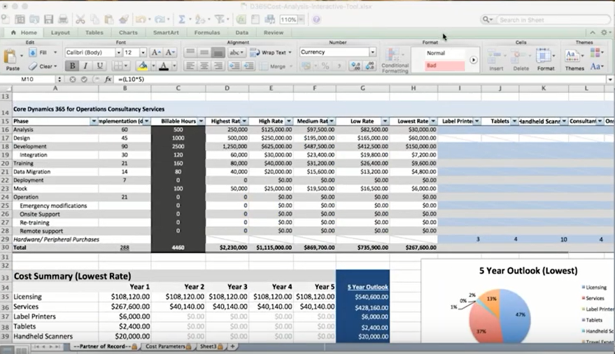 Cost analysis sheet for D365FO implementation