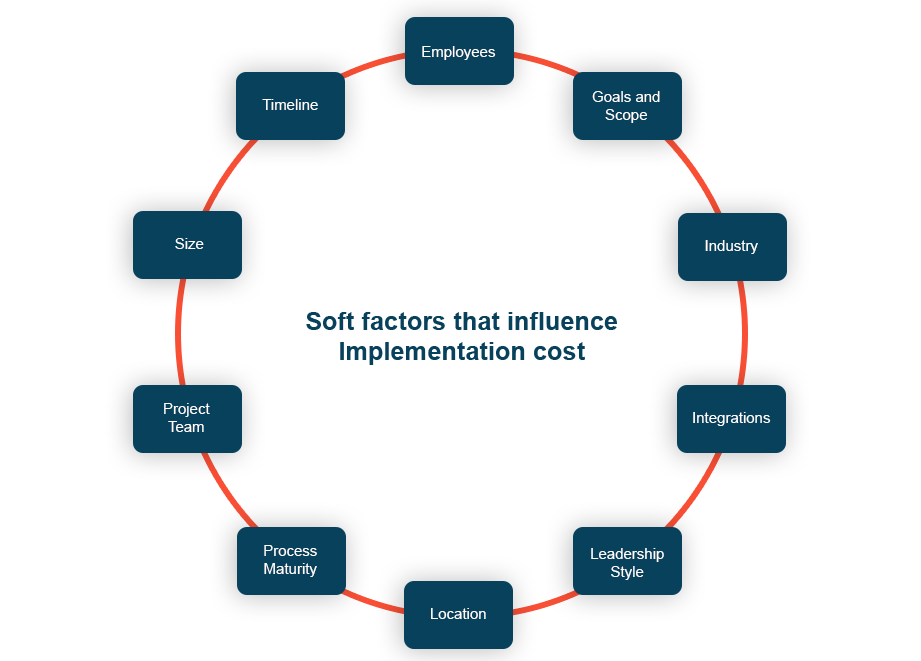 Human factors such as employees, leadership style as well as process factors such as the size of the project team, timelines, and so on fall under hidden or “soft” cost heads. Identifying these cost heads and gauging their impact on the overall implementation helps in accurate budgeting and setting the right expectations with the involved teams.